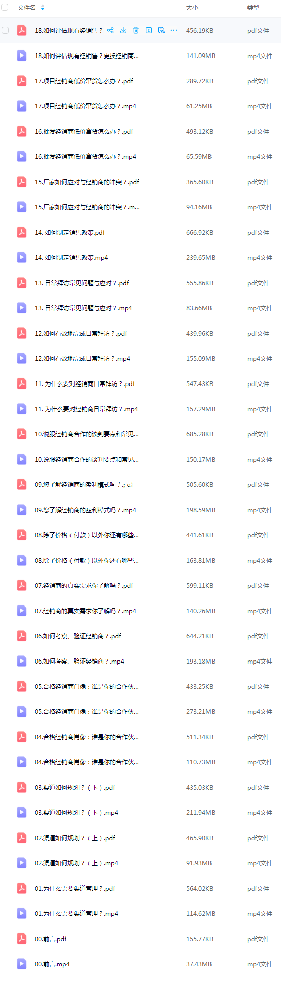 【极全网】渠道开发与经销商管理(完结版)云存储资源下载目录1个子文件夹0个文件4个