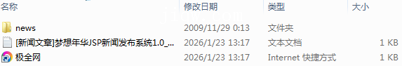 【极全网】[新闻文章]梦想年华JSP新闻发布系统1.0_jspnews-本地下载目录1个子文件夹1个文件2个