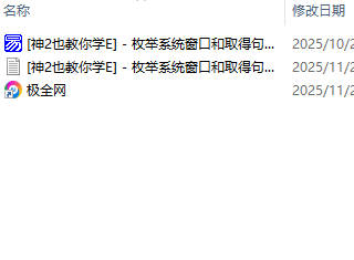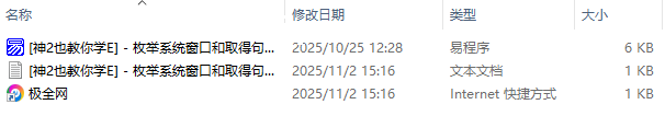 【极全网】[神2也教你学E] - 枚举系统窗口和取得句柄例程及关闭窗口易语言源码本地下载目录1个子文件夹0个文件3个
