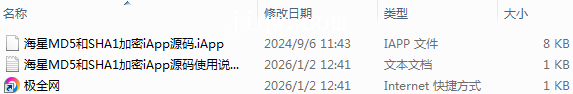 【极全网】海星MD5和SHA1加密iApp源码目录1个子文件夹0个文件3个