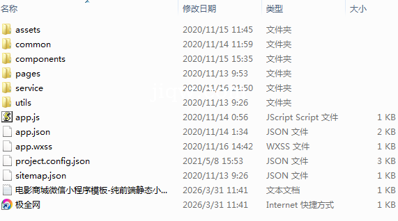 极全网】电影商城微信小程序模板-纯前端静态小程序源码目录1个子文件夹6个文件7个