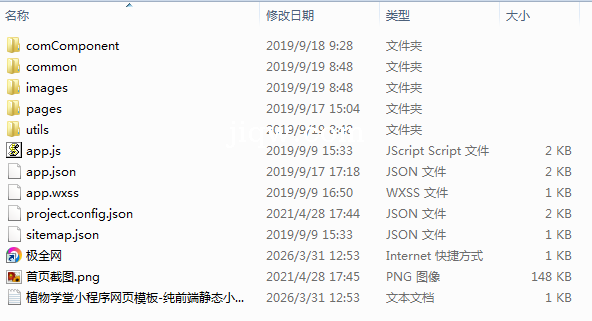 极全网】植物学堂小程序网页模板-纯前端静态小程序源码目录1个子文件夹5个文件8个