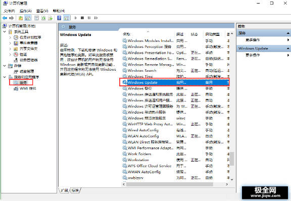 ⑥点击服务,在右侧的下拉框中找到,Windows update服务