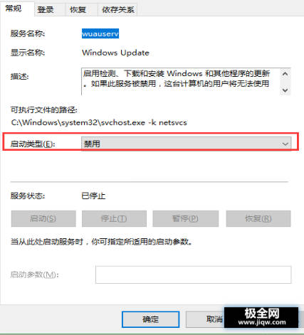 ⑦查看Windows update服务属性为禁用,证明系统更新禁用成功。
