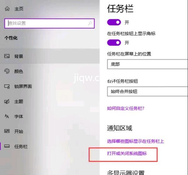 3、在弹出窗口的右侧往下拉,寻找“开启或关掉系统图标”。