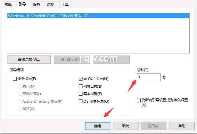 4.然后切换到引导选项卡。在启动选项卡上,将超时设置为3秒。
