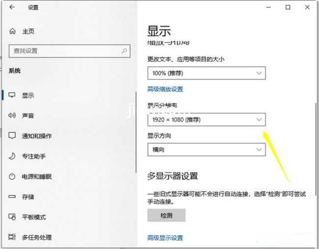 3、在显示设置的界面能够立即见到分辨率设置,这儿能够调节关于显示屏显示的有关设置。大家立即点一下分辨率边上的倒三角。