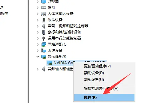 2、假如未安装独立显卡驱动便会发生黄色感叹号,右键独立显卡名字,选择属性。