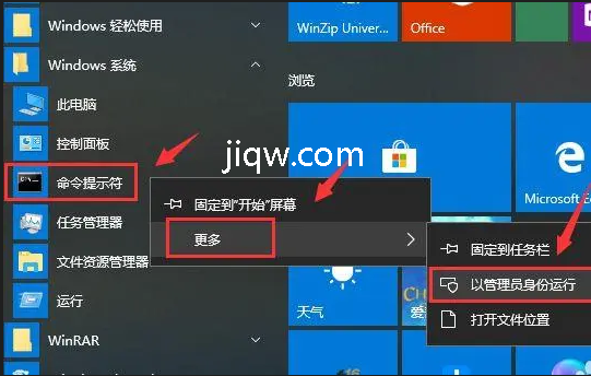 1、最先鼠标单击开始,点一下windows 系统文件夹,右键命令提示符-大量-以管理员真实身份运行。
