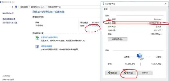 参考方法一,点一下“以太网接口——网络和共享管理中心”,进到“网络和共享管理中心”。点一下连接的以太网接口,点一下禁用随后再启用。