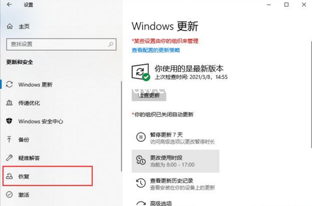 2、发生的设置界面,大家点一下左边的“恢复”选项,如下图所示: