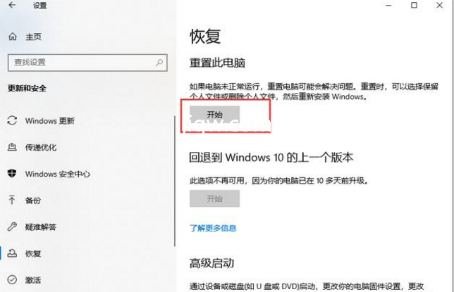 3、随后大家寻找重置此电脑下面的点一下开始按键,如下图所示: