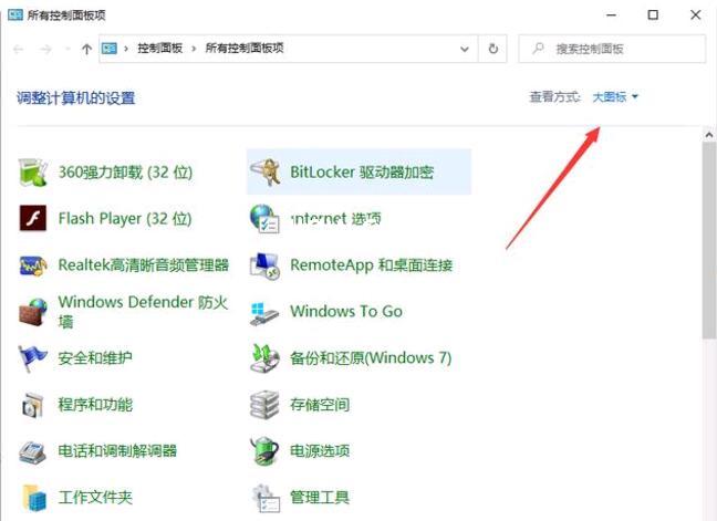 2、在开启的控制面板窗口中,点一下右上方的“查看方式”往下拉菜单,在弹出菜单中点一下“大图标”菜单。