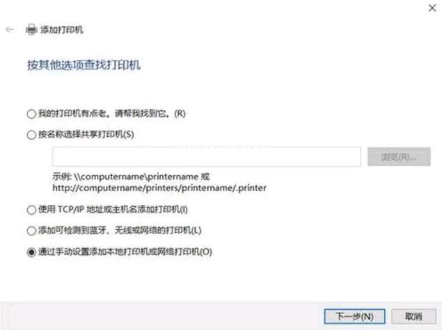 6、下面在打列的添加打印机窗口中点一下“根据手动式设置添加当地打印机或网络打印机”一项,随后点一下下一步按键。
