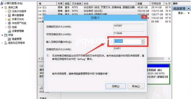 2.进入磁盘管理后,可以看到分区情况。然后选择要分区的磁盘,右键单击,然后选择“压缩卷”,如图;