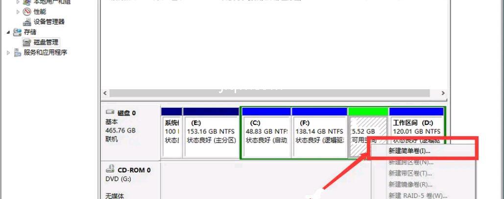 6.选择空白分区,右键单击并选择新建简单卷。