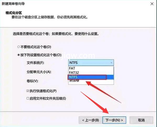 10.然后为新创建的简单卷选择磁盘格式,这里一般选择“NTFS”。