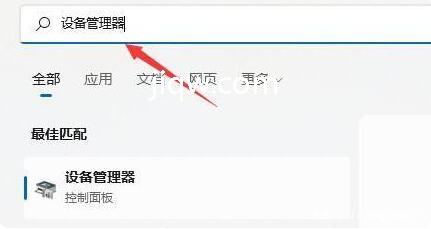 2、此刻我们可以试着开启开始菜单,在上边搜索并进到“机器设备管理器”