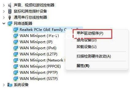 3、然后进行网络电源适配器,寻找无线网口机器设备,右键选中,点一下“升级驱动程序”