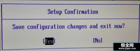 敲击键盘上F10按键,此时会出现如下界面,意思是 保存更改设置并退出BIOS界面,请选择 YES 敲击 Enter,即保存更改并推出
