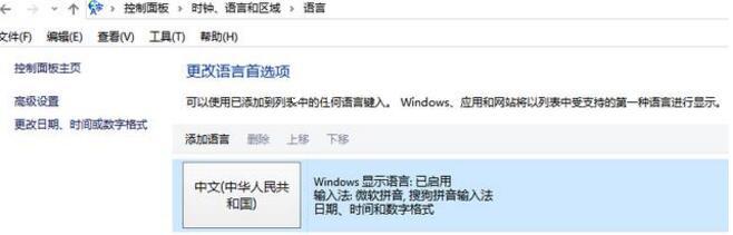 控制面板开启“钟表、语言和区域”设置界面,选中“语言”设置。