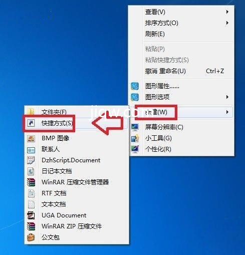 1、使用鼠标右键点击桌面空白处,在弹出的菜单中点选新建→快捷方式。