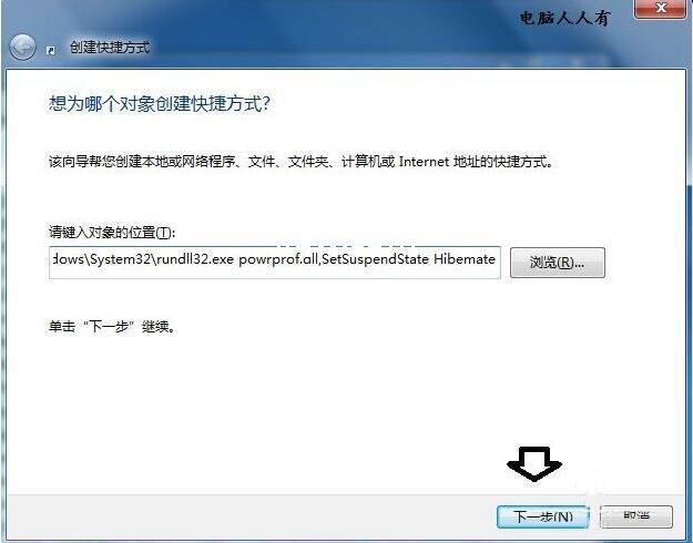C:\Windows\System32\rundll32.exe powrprof.dll,SetSuspendState Hibemate →下一步。