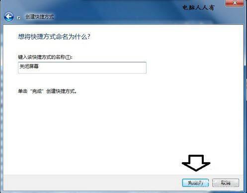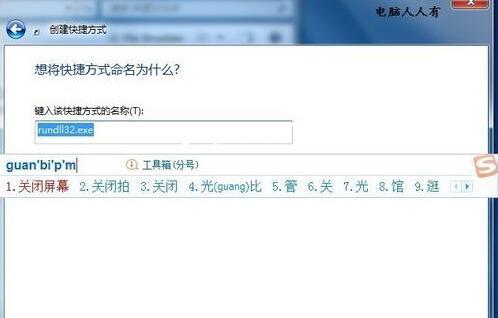 3、将快捷方式从原来的:rundll32.exe →重命名为:关闭屏幕。