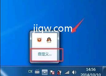 2、先检查声音设置。使用鼠标左键点击任务栏通知区的隐藏箭头▲→自定义。
