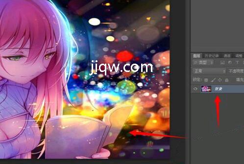 3、将我们下载好的图片,或者自己非常喜欢的图片用PS打开,然后将其拖动到刚刚新建的文件里面。以这张美女图为例。