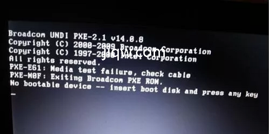 解决方法:故障是电脑找不到启动设备。这时候首先打开机箱盖看一下硬盘的连接线是否正常(电源线和数据线),如果都正常就进入BIOS设置界面,把第一启动项设置为硬盘启动。这样基本上就能解决这类问题。