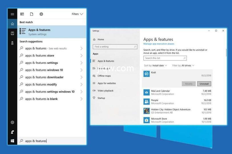 单击“ 开始”按钮,键入“ 应用和功能”,然后选择“系统设置”结果