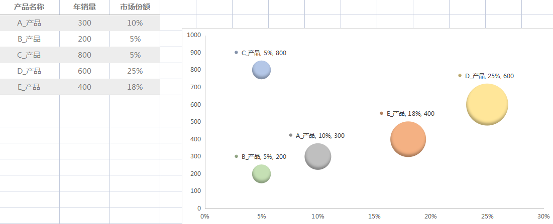 标题:产品销售量及市场份额气泡图