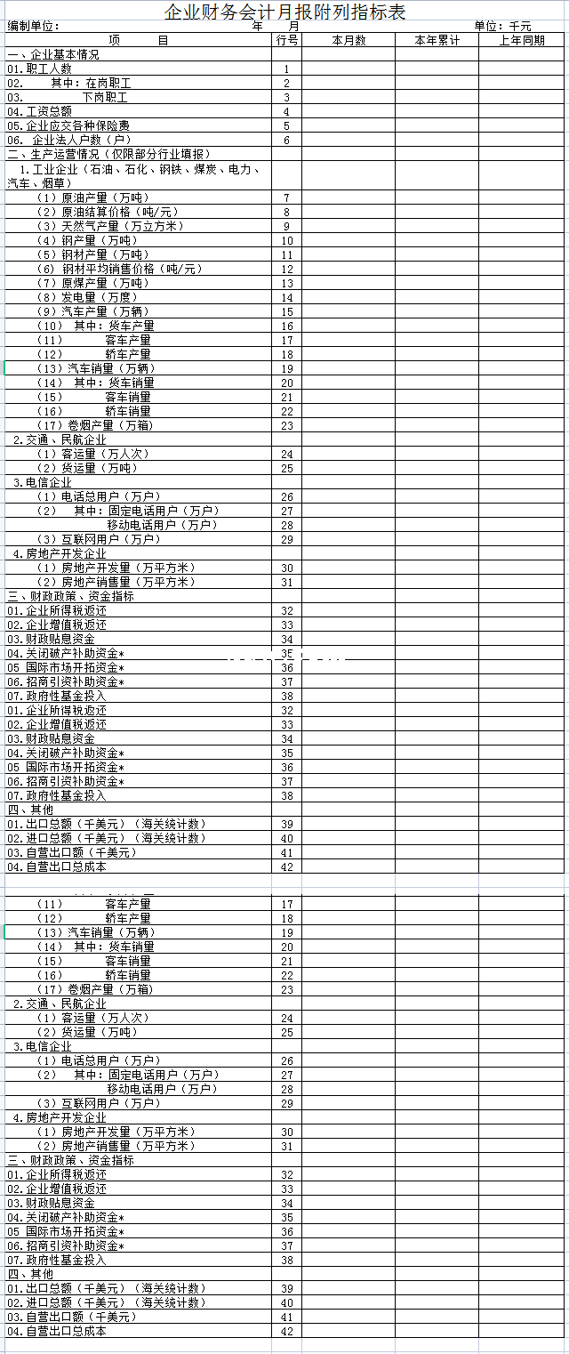 企业财务会计月报附列指标表-Excel表格