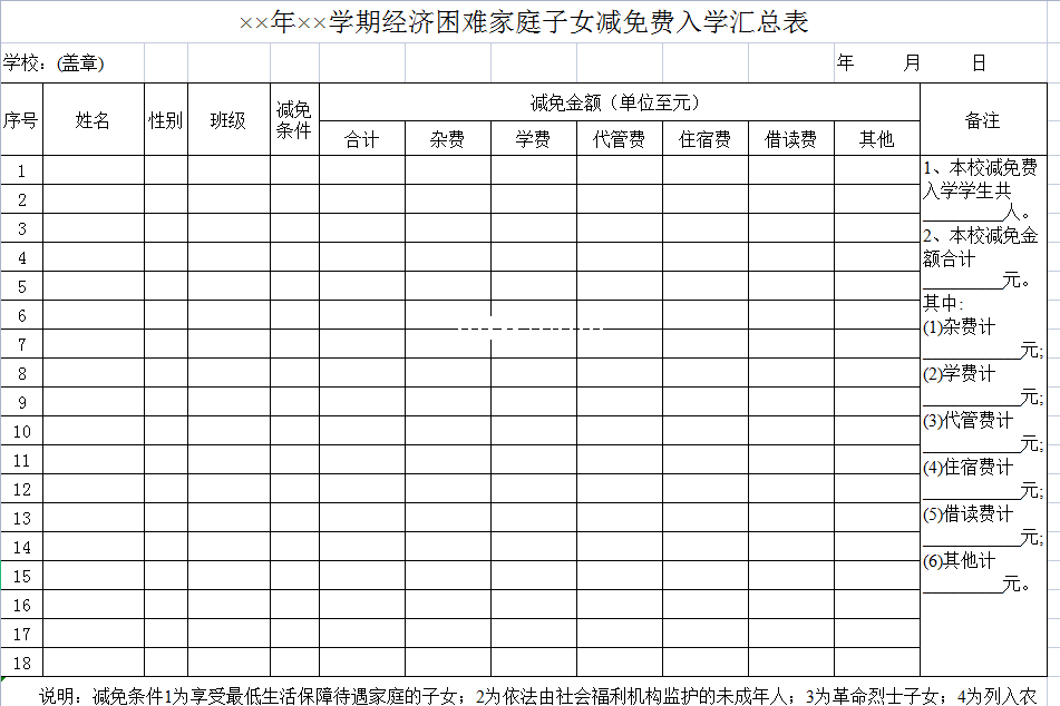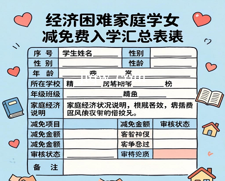 标题:经济困难家庭子女减免费入学汇总表-Excel表格