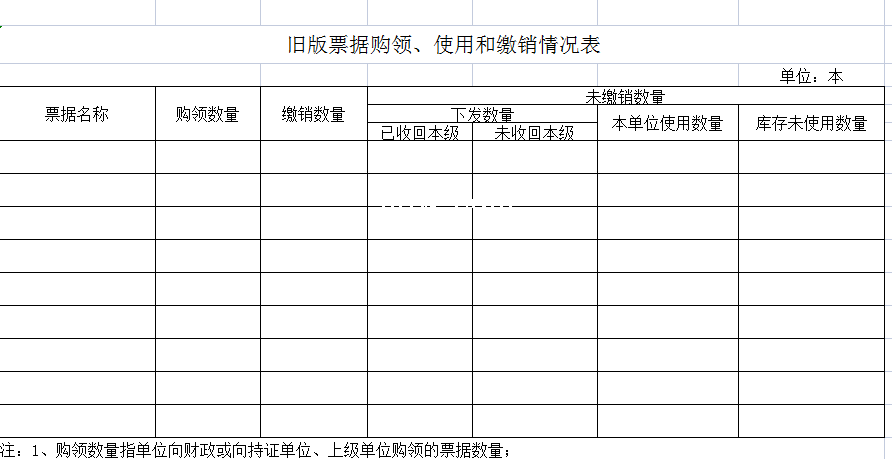 标题:旧版票据购领、使用和缴销情况表-Excel表格