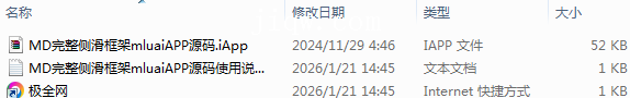 【极全网】MD完整侧滑框架mluaiAPP源码目录1个子文件夹0个文件3个