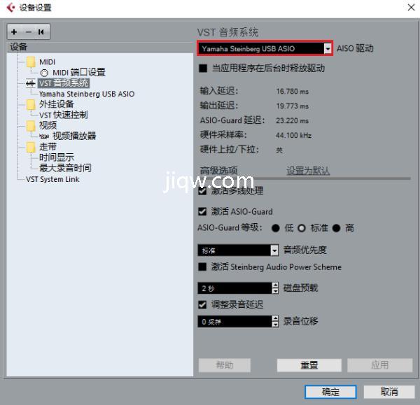 点击“设备”,选择“设备设置”,在左边的一列中找到“VST音频系统”。