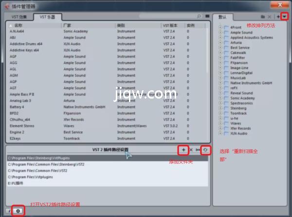 然后点击项目旁边的加号,添加你存放VST文件的文件夹,再点一下右边的“重新扫描全部”,然后Cubase就会自动识别你设置的文件夹中的所有vst插件。
