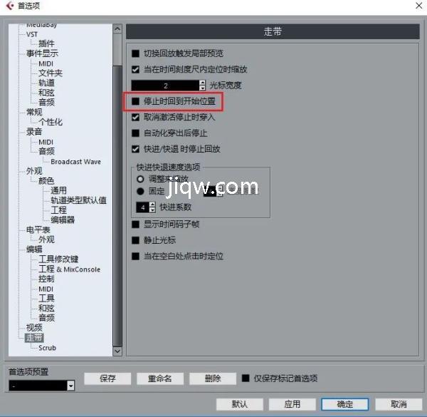 选中“走带”,勾选“停止时回到开始位置”,这样,在暂停时就会自动回到播放时的起点了。