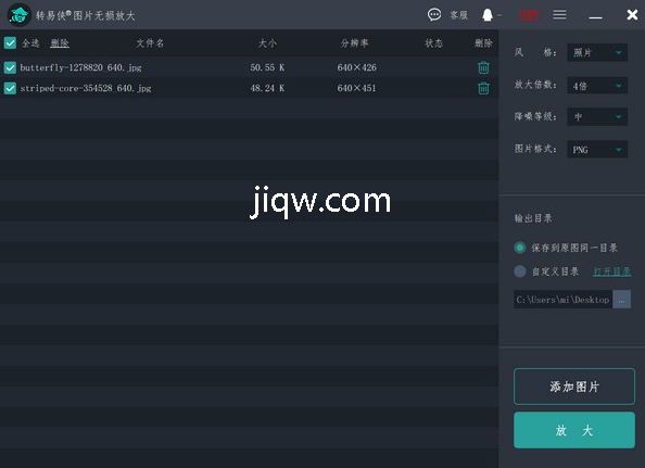 2、照片添加完成,设置放大后的参数和保存地址。参数中风格选择照片,其他根据需要设置即可。接着点击“放大”按钮,软件开始运行。