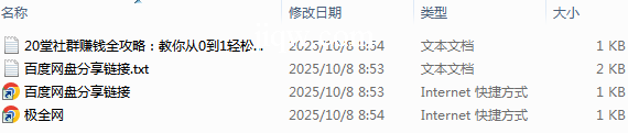 【极全网】20堂社群赚钱全攻略:教你从0到1轻松实现引流变现(完结版)云存储资源下载目录1个子文件夹0个文件4个