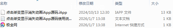【极全网】点击渐变显示消失动画iApp源码目录1个子文件夹0个文件3个