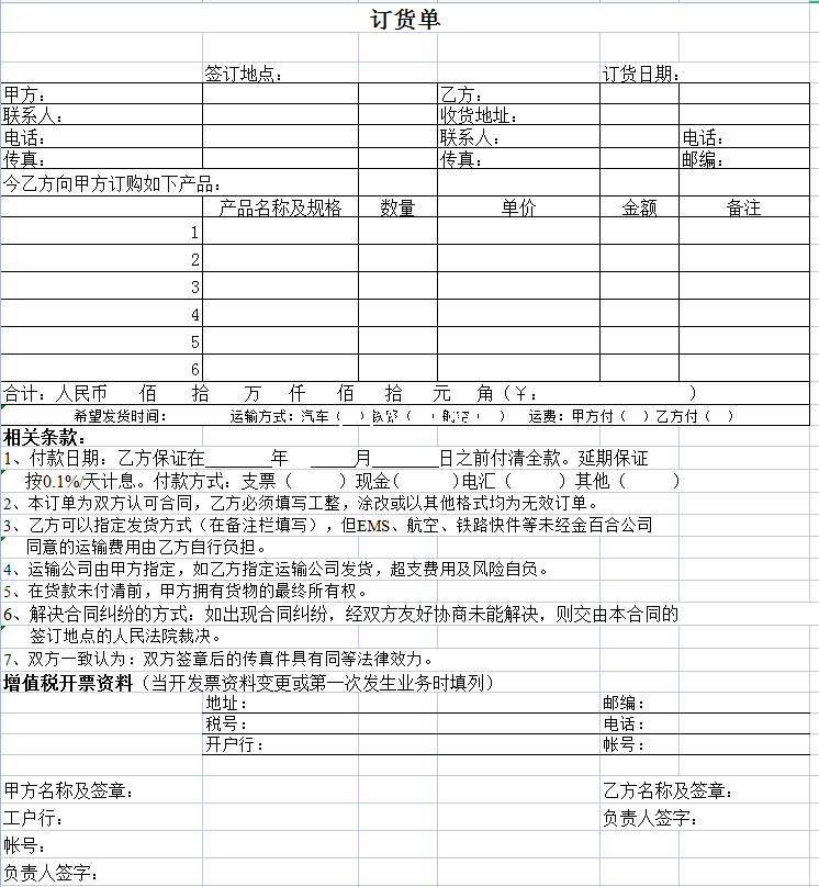 订货单-Excel表格