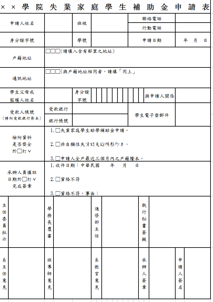 标题:學院失業家庭學生補助金申請表-Excel表格