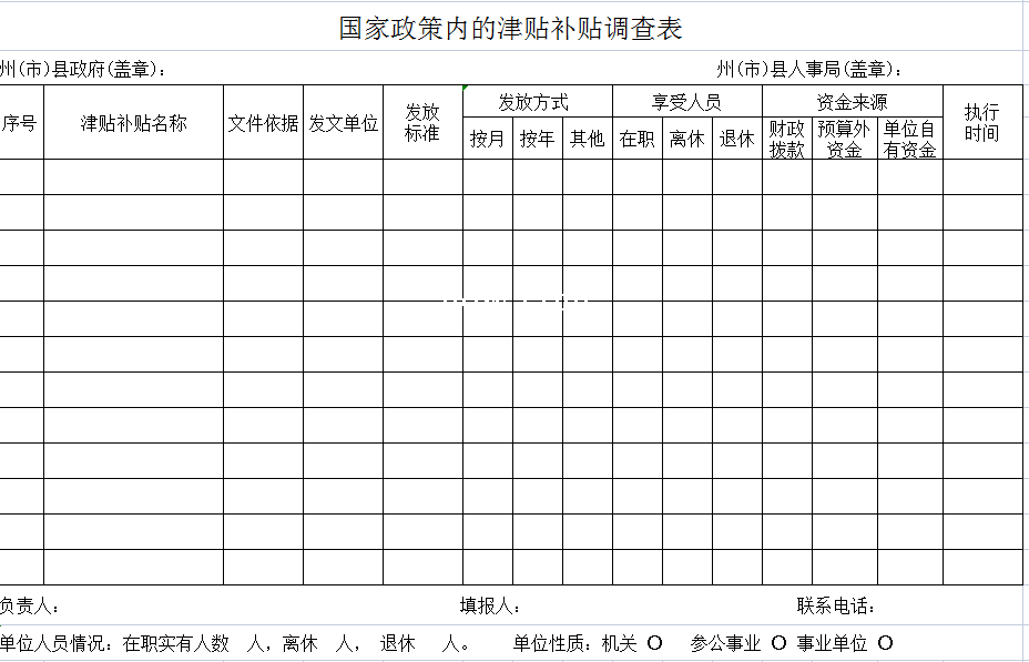 标题:国家政策内的津贴补贴调查表-Excel表格
