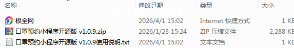 极全网】口罩预约小程序开源版 v1.0.9目录1个子文件夹0个文件3个