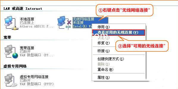 右键点击桌面上的“网上邻居”-选择“属性”-右击“无线网络连接”-选择“查看可用的无线连接”