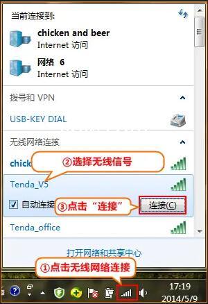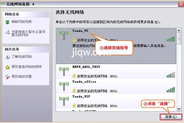 点击桌面右下角的无线网络连接图标 ,在打开的信号列表中选择路由器的无线信号后点击连接按钮。