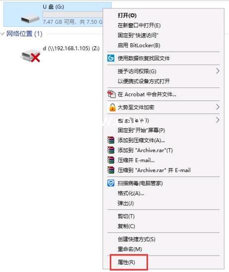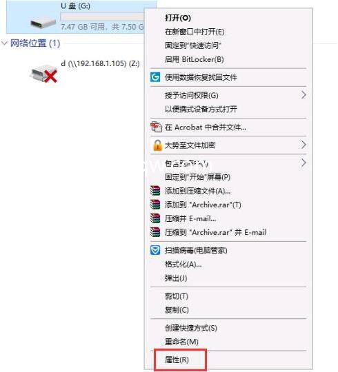 1、一般的逻辑坏道很好解决,在U盘盘符的上方点击右键,在弹出的窗口中点击属性。